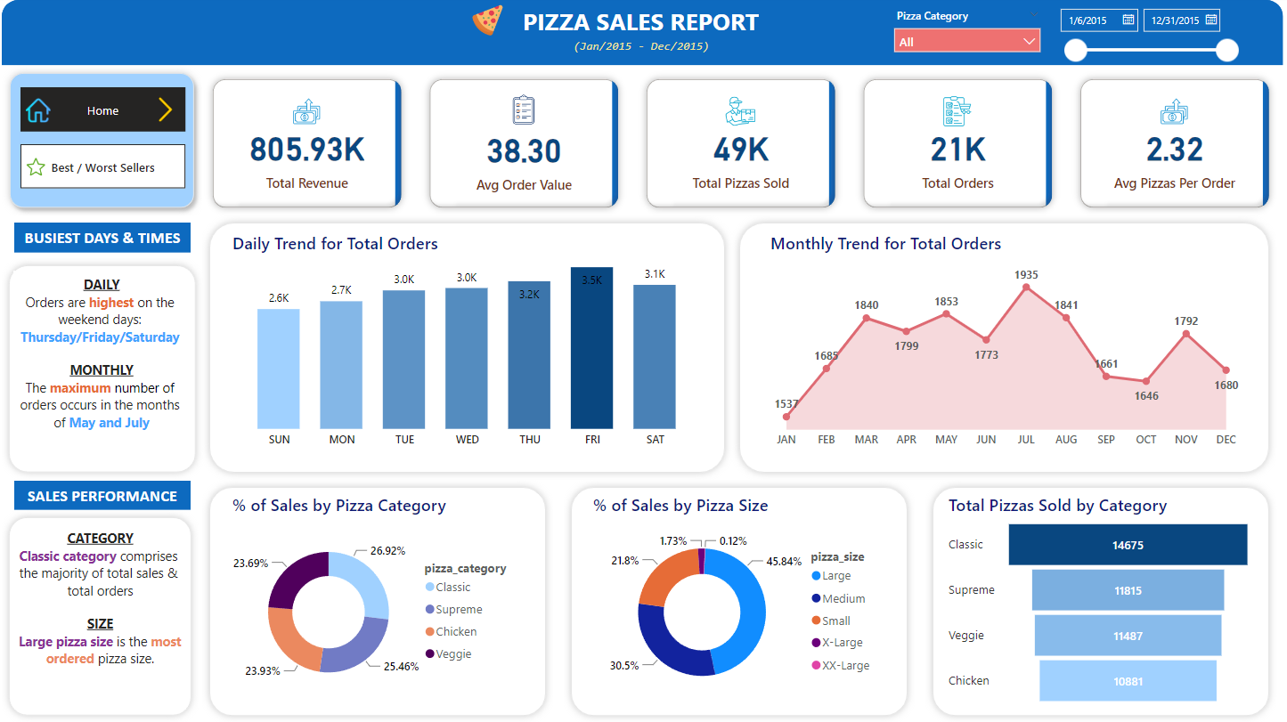Utilizing SQL and Power BI, this project involved data cleansing and transformation to analyze key metrics and visualize trends, ultimately providing actionable insights for the pizza company’s sales performance over the past year.